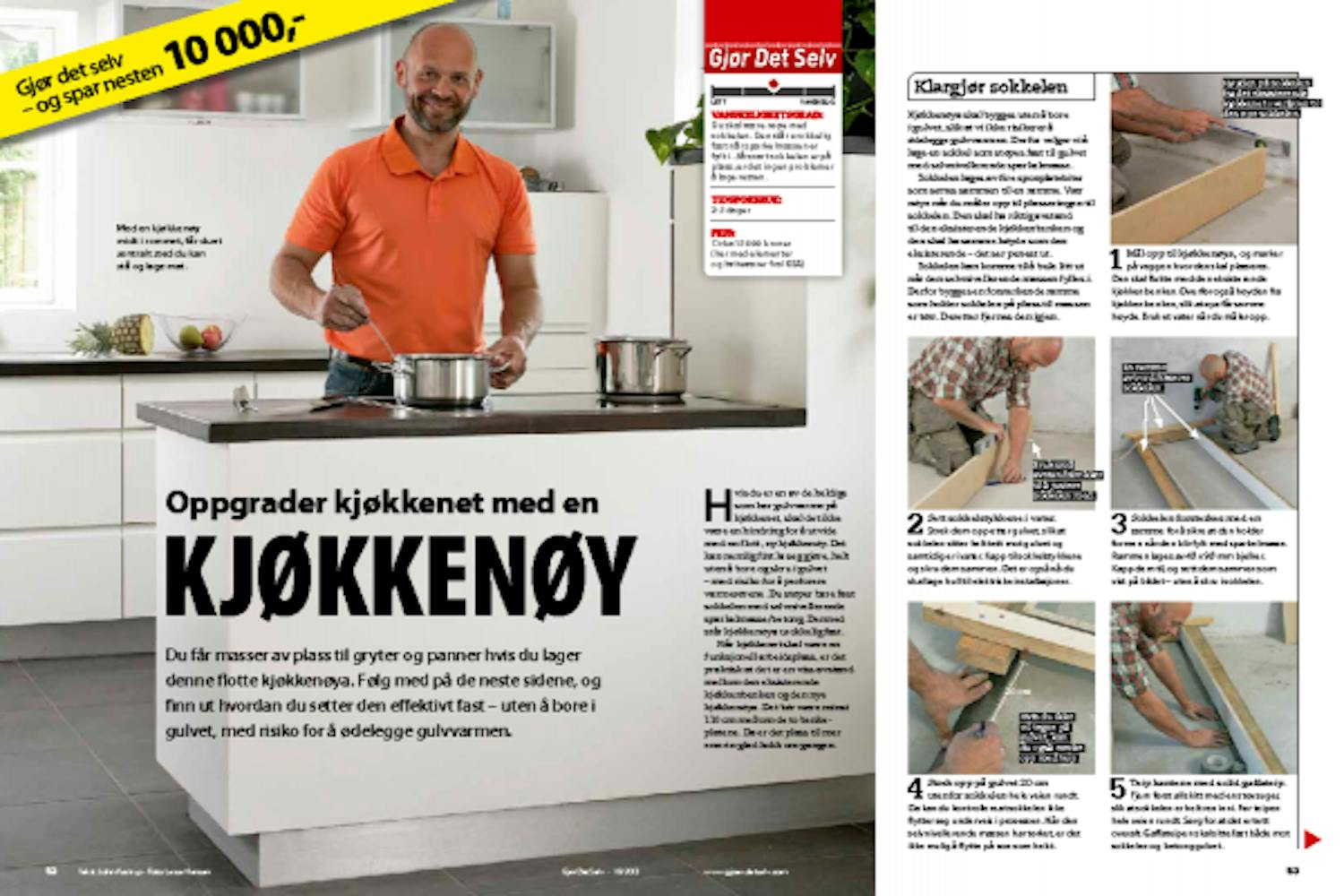 Sokkelen lages av fire spon platebiter som settes sammen til en ramme. Vær nøye når du måler opp til plasseringen til sokkelen. Den skal ha riktig avstand til den eksisterende kjøkkenbenken og den skal ha samme høyde som den eksisterende - det ser penest ut.