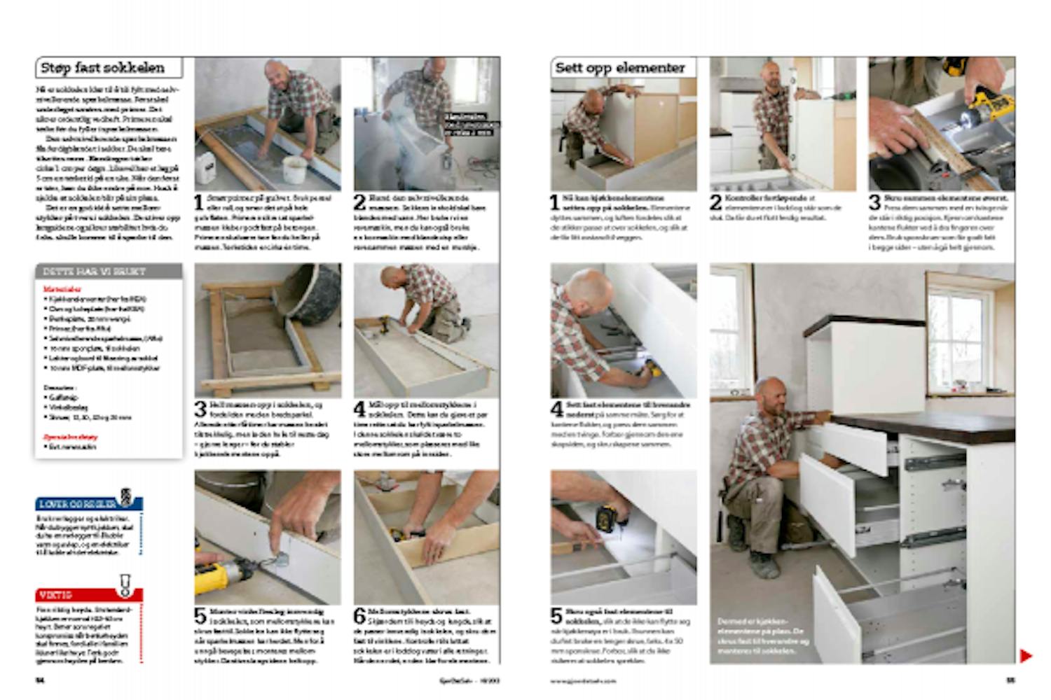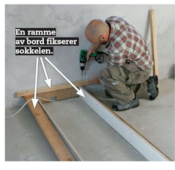 Sett sokkelstykkene i vater. Strek dem opp etter gulvet, slik at sokkelen sitter helt tett mot gulvet og samtidig er i vater. Kapp til sokkelstykkene og skru dem sammen. Det er også nå du skal lage hull til elektriske installasjoner.