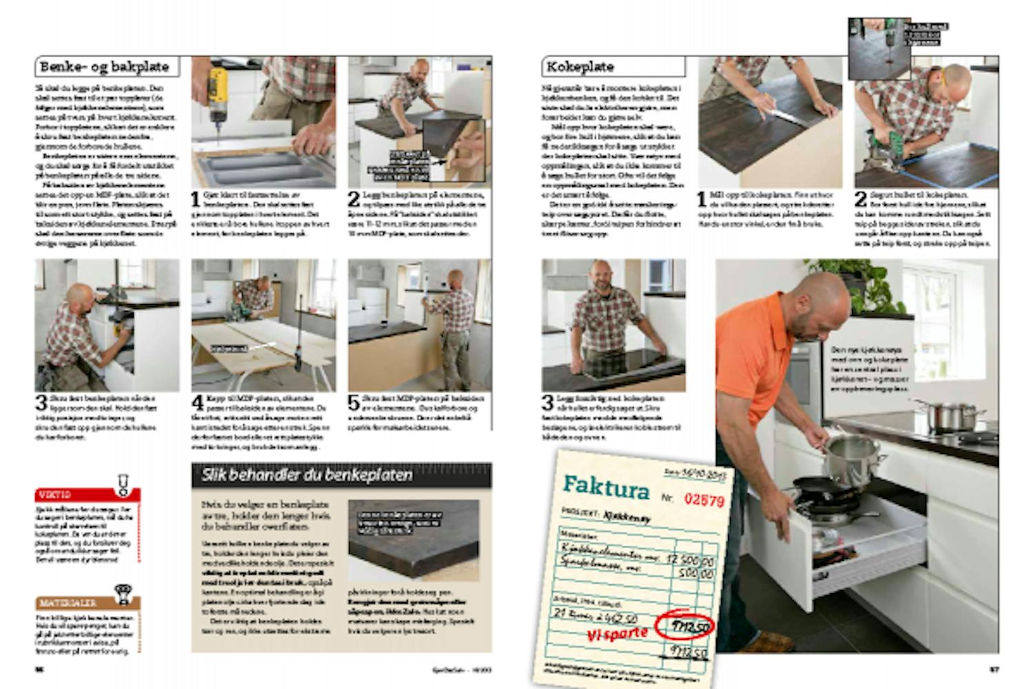 Så skal du legge på benkeplaten. Den skal settes fast til et par topplater (de følger med kjøkkenelementene), som settes på tvers på hvert kjøkkenelement. Forbor i top platene, slik at det er enklere å skru fast benke platen nedenfra, gjennom de forborede hullene.