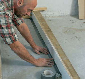 Strek opp på gulvet 20 cm utenfor sokkelen hele veien rundt. Da kan du kontrollere at sokkelen ikke flytter seg underveis i prosessen. Når den selvnivellerende massen har tørket, er det ikke mulig å flytte på noe som helst.