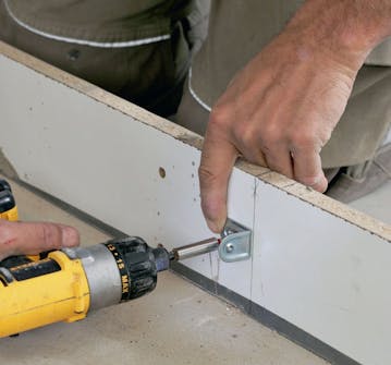 Monter vinkelbeslag innvendig i sokkelen, som mellomstykkene kan skrus fast til. Sokkelen kan ikke flytte seg når sparkelmassen har herdet. Men for å unngå bevegelser, monteres mellomstykker. Da stives langsidene helt opp.