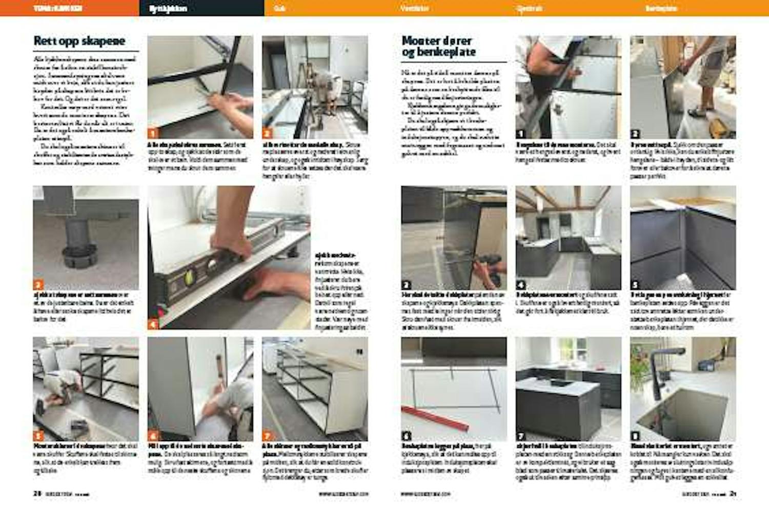 Kontroller nøye med vateret etter hvert som du monterer skapene. Det beste resultatet får du når alt er i vater. Da er det også enkelt å montere benkeplaten etterpå.
