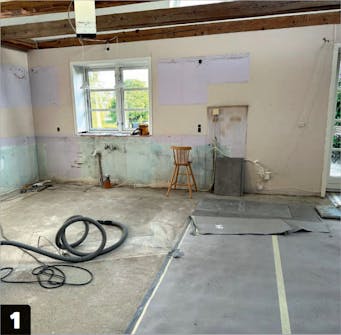 Det gamle kjøkkenet er revet. Her skal det legges nytt gulv med fliser før det nye kjøkkenet settes opp.
