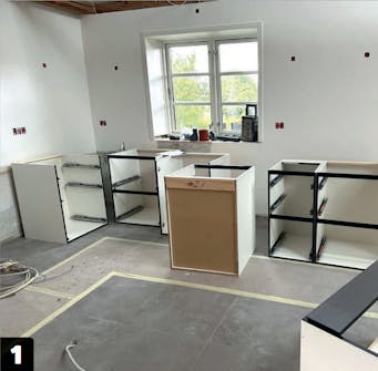De monterte elementene er levert. Nå skal de bare pakkes ut og plasseres på de riktige stedene. Alle skapene er merket med et nummer som angir plasseringen.