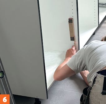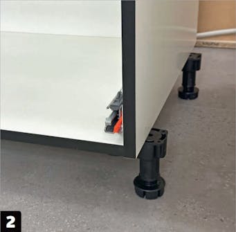 Sjekk at skapene er satt sammen over et av de justerbare beina. Da er det enkelt å heve eller senke skapene litt hvis det er behov for det.