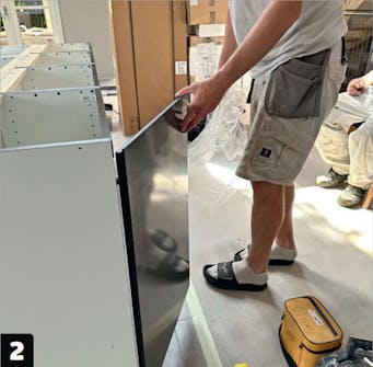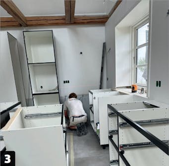 Plasser skapene etter tegningen. Det er nyttig at alle er nummerert - det gjør jobben enklere. På gulvet her er det lagt ut papp vinkelrett på veggene, som skapene kan rettes inn etter.