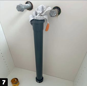 I skapet til vasken skal det skjæres ut flere steder, både to hull i bakkledningen til kaldt og varmt vann, og i bunnen av skapet til avløpet.