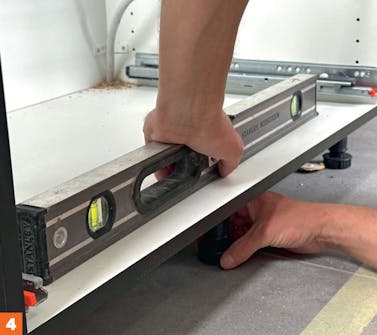 Sjekk med vateret om skapene er vannrette. Hvis ikke, finjusterer du bare ved å skru foten på beinet opp eller ned. Det vil som regel være nødvendig noen steder. Vær nøye med finjusteringsarbeidet.