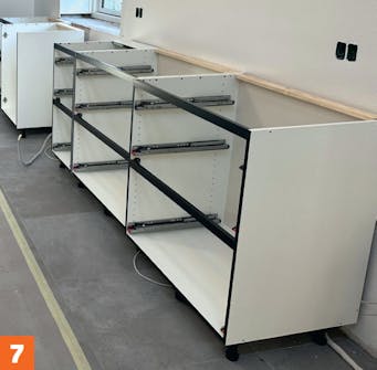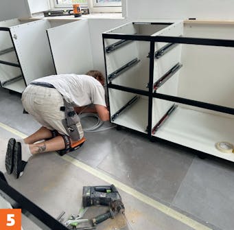 Du skal også montere skinner til skuffer og stabiliserende avstandsstykker som holder skapene sammen.