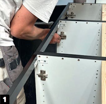 Hengslene til dørene monteres. Det skal være et hengsel øverst og nederst, og hvert hengsel festes med to skruer.