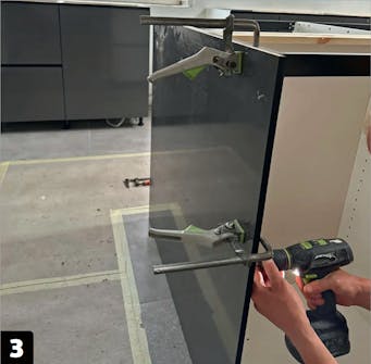 Her skal det sitte dekkplater på enden av skapene og kjøkkenøya. Dekkplaten spennes fast med tvinger når den sitter riktig. Skru den fast med skruer fra innsiden, slik at skruene ikke synes.