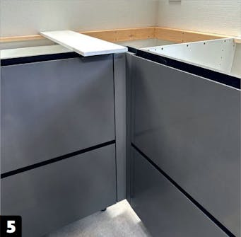 Det lages en pen avslutning i hjørnet før benkeplaten settes opp. På veggen er det satt to vannrette lekter som kan understøtte benkeplaten i hjørnet, der det ikke er noen skap, bare et hulrom.