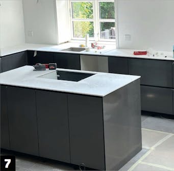 Du skal også skjære ut i benkeplaten til både oppvaskkummen og induksjonstoppen, og du skal avslutte mot veggen med fugemasse og ned mot gulvet med en sokkel.
