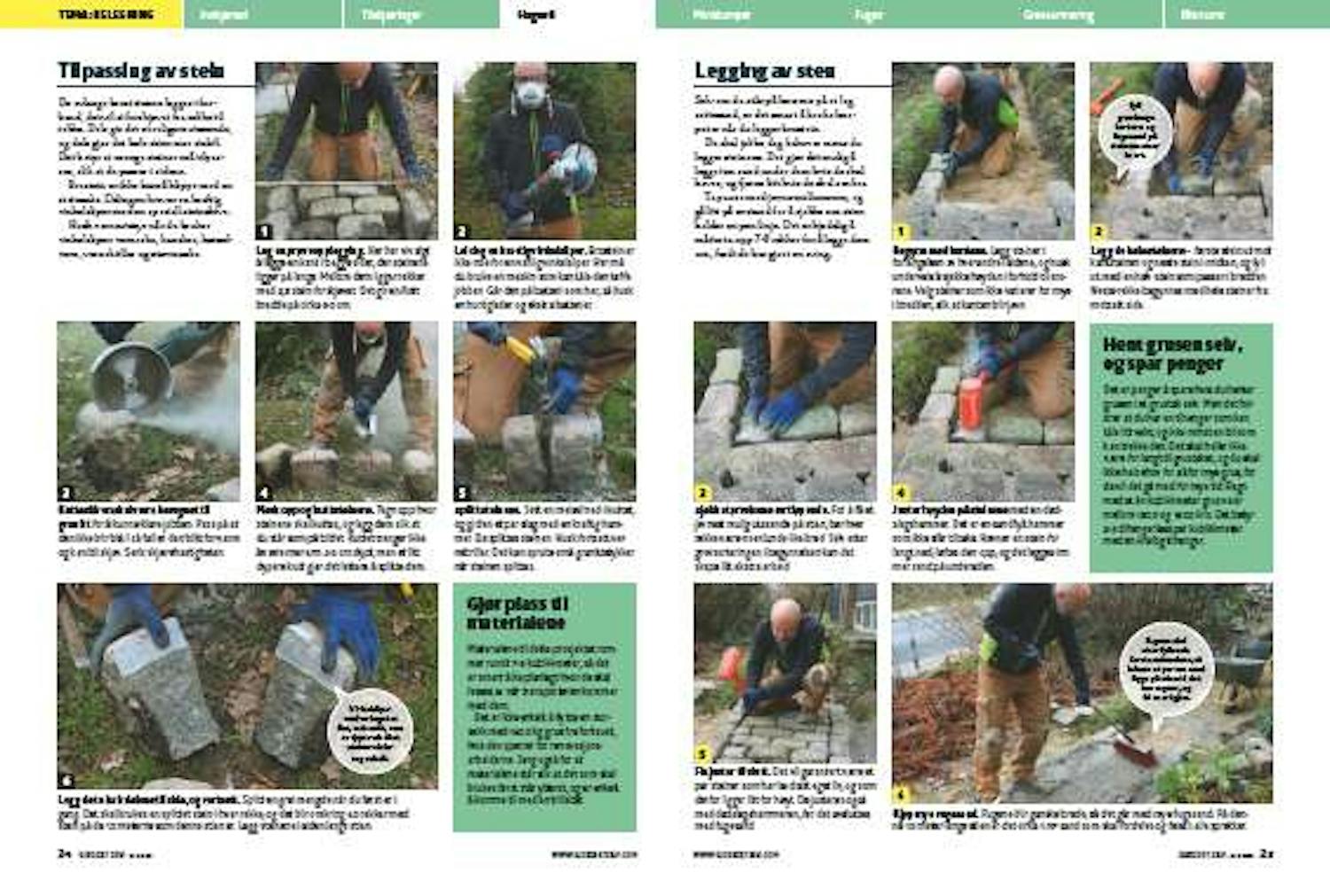 Lag en prøveopplegging. Her har vi valgt å legge en kant i begge sider, der steinene ligger på langs. Mellom dem ligger rekker med 2,5 stein forskjøvet. Det gir en flott bredde på cirka 90 cm.