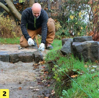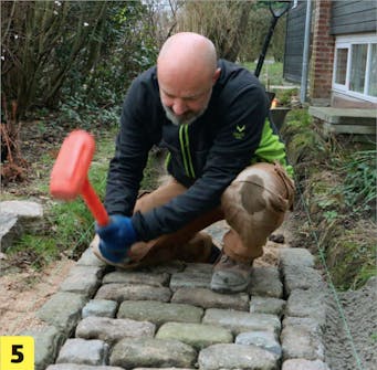 Du skal jobbe deg bakover mens du legger steinene. Det gjør det mulig å legge inn sand under dem hvis de skal heves, og fjerne litt hvis de skal senkes.