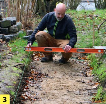 Bruk et vater til å justere fall. Hvis du vil unngå at det skal renne regnvann fra stien inn mot huset, er det nødvendig med et fall vekk fra huset. Det er enkelt nok: Bare senk den ytterste snoren 1 cm per meter.