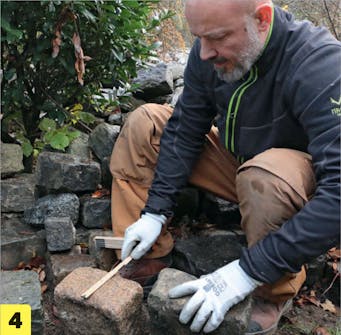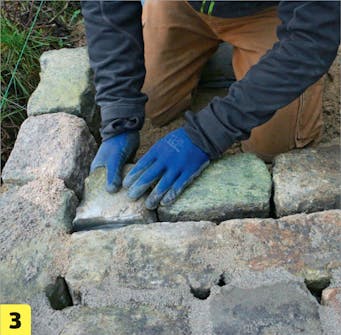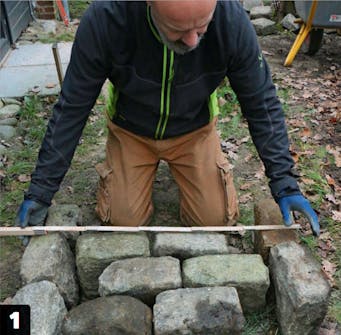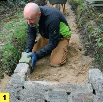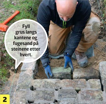 Begynn med kantene. Legg steiner i forlengelsen av hverandre i sidene, og husk underveis å sjekke høyden i forhold til snorene. Velg steiner som ikke varierer for mye i bredden, slik at kanten blir jevn.