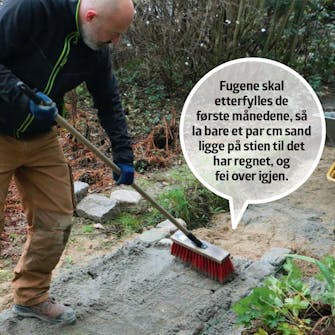 Finjuster til slutt. Det vil garantert være et par steiner som har levd sitt eget liv, og som derfor ligger litt for høyt. De justeres også med dødslagshammeren, før det avsluttes med fugesand.