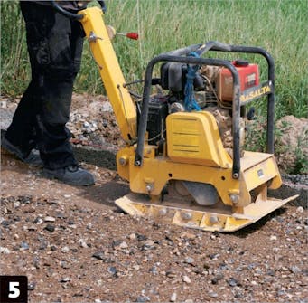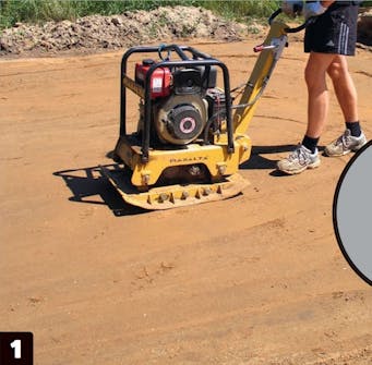 Det nederste bunnsikringslaget komprimeres med en 200 kg platevibrator. Fordel laget så jevnt som mulig, og kjør på kryss og tvers med platevibratoren.
