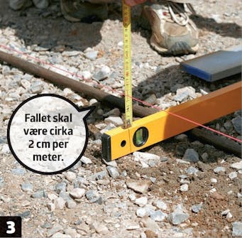 Legg på bærelaget og lag fall i innkjørselen, slik at vann blir ledet vekk. Plasser to stålrør i grusen som fallet kan måles ut fra. Rørene skal ligge 2 cm over planlagt høyde, fordi laget blir komprimert.