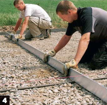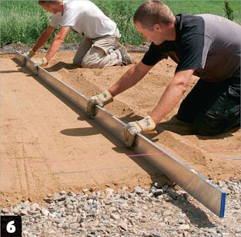 Legg på avrettingsgrus, og rett det opp med rettholten, som igjen trekkes langs stålrørene som du har lagt ned i riktig høyde i underlaget. Avrettingsgrusen skal ha en høyde på cirka 3 cm.