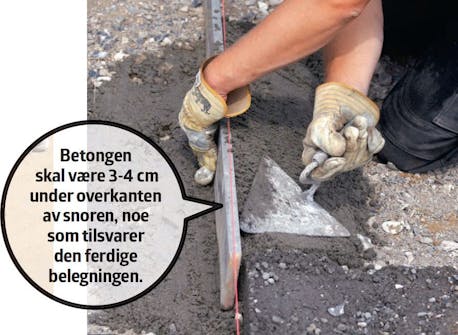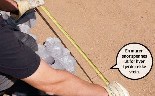 Når du skal legge stein på et større område, er det en god idé å styre retningen med en snor, slik at du ikke risikerer at en liten skjevhet vokser seg stor. Det kan du gjøre ved å sette opp en snor for hver fjerde rekke, som steinene skal rettes inn etter.