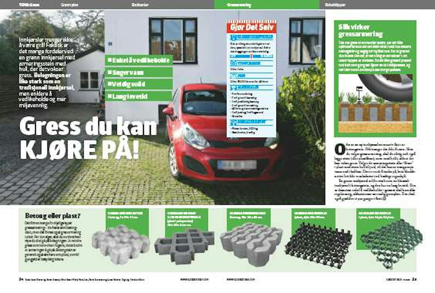 Ofte er en ny innkjørsel en massiv flate av betongstein. Slik trenger det ikke å være. Hvis du velger gressarmering, skal du riktig nok også legge stein (eller plastfliser), men med hull i, slik at det kan vokse gress. Velger du armeringsstein eller “fliser” i plast med store hull til jord, vil det kunne trenge mye vann ned i bakken. Det er verdt å tenke på, hvis kloakk­ nettet lett blir overbelastet ved kraftige regnskyll.