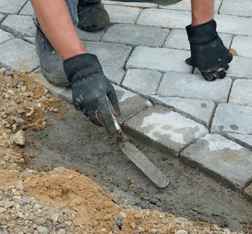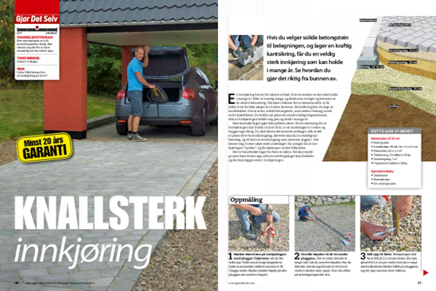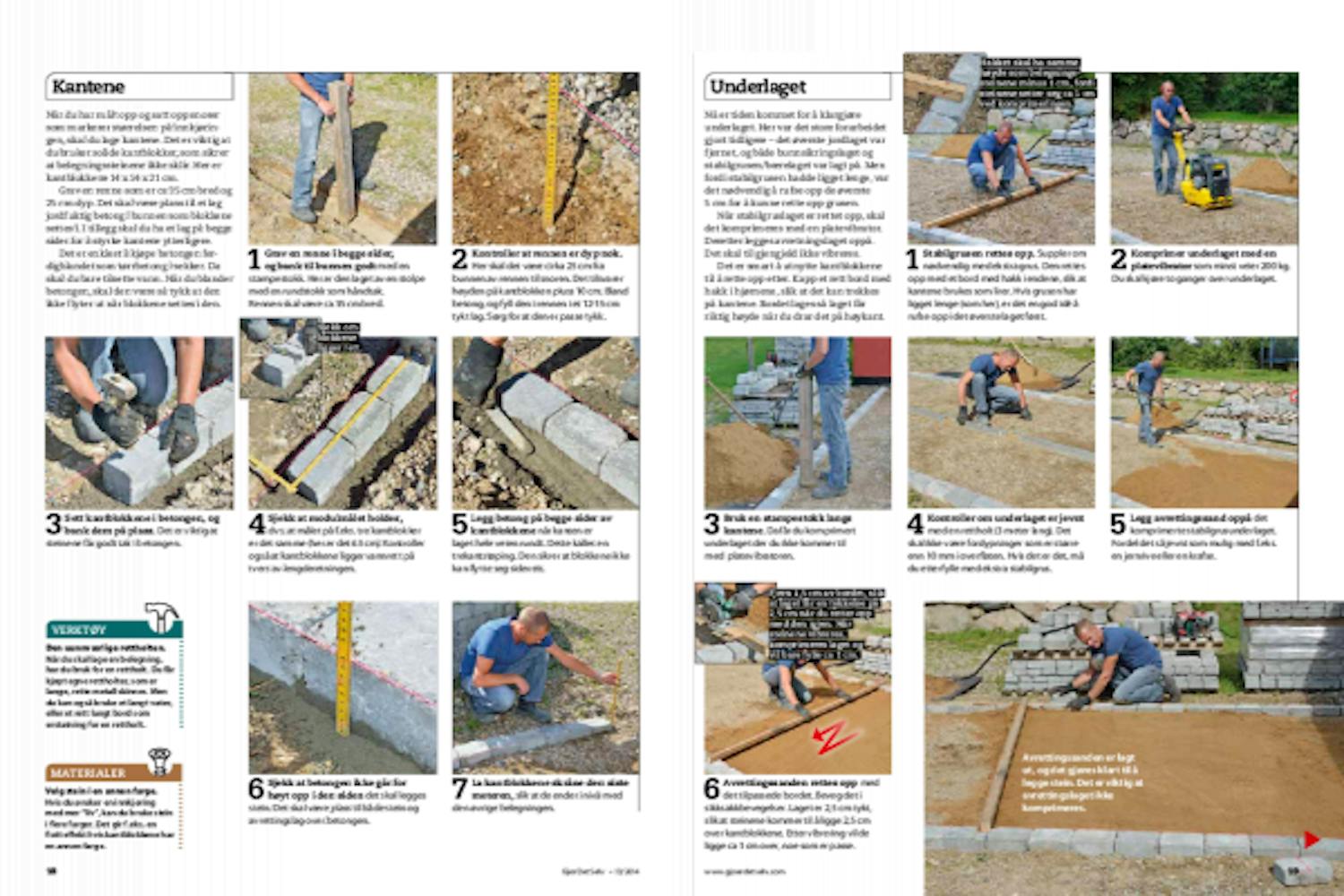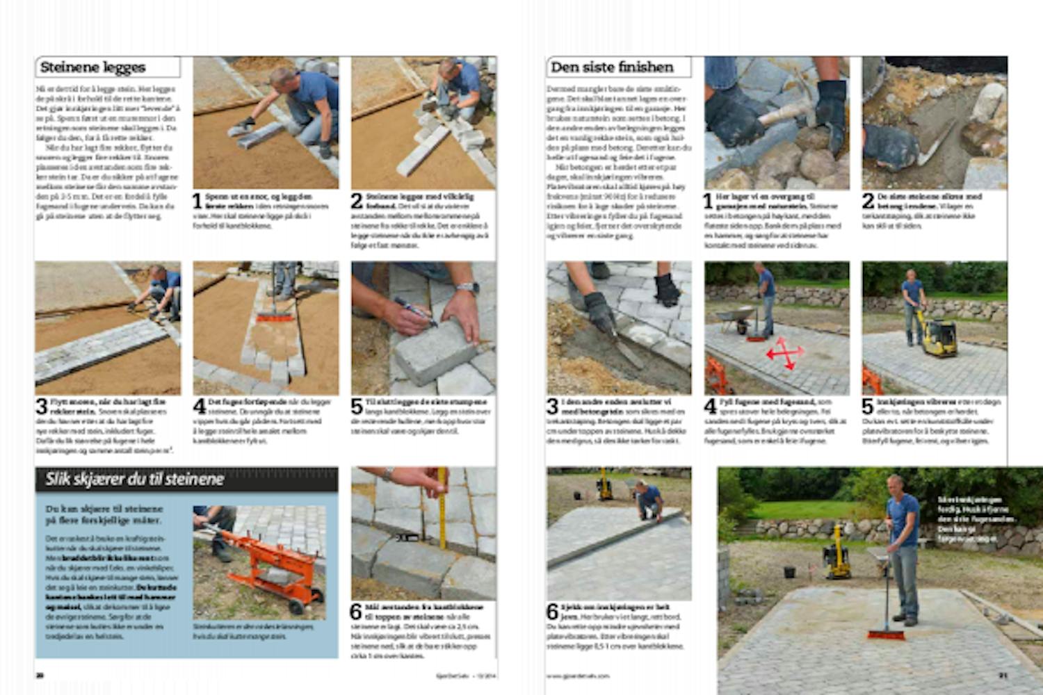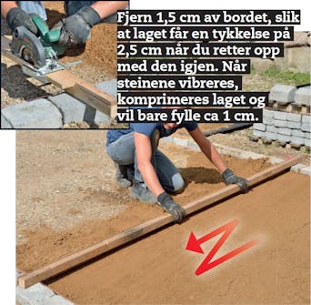 Dermed mangler bare de siste småtingene. Det skal blant annet lages en overgang fra innkjøringen til en garasje. Her brukes naturstein som settes i betong. I den andre enden av belegningen legges det en vanlig rekke stein, som også holdes på plass med betong. Deretter kan helle ut fugesand og feie det i fugene.
