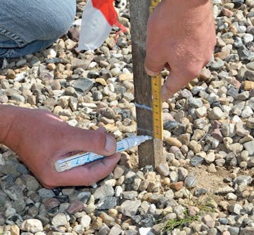 Kontroller om underlaget er jevnt med en rettholt (3 meter lang). Det skal ikke være fordypninger som er større enn 10 mm i overflaten. Hvis det er det, må du etterfylle med ekstra stabilgrus.