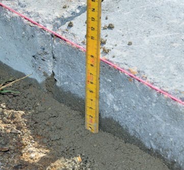 Sjekk at betongen ikke går for høyt opp i den siden det skal legges stein. Det skal være plass til både stein og avrettingslag over betongen.