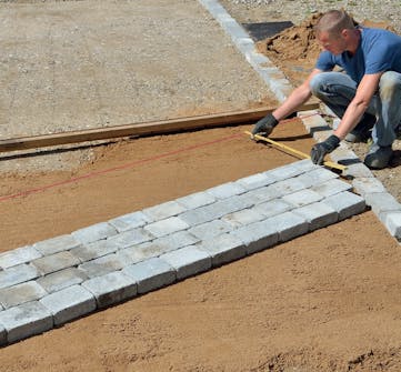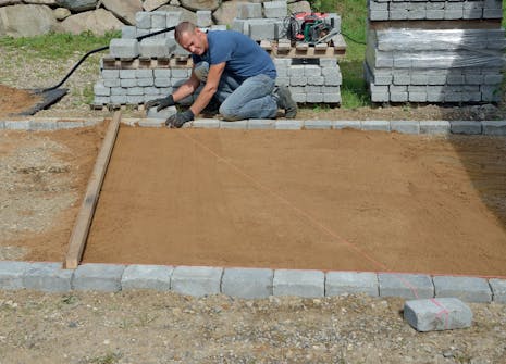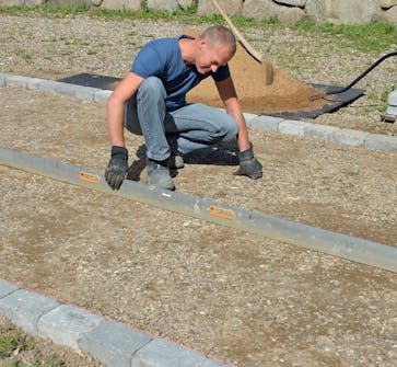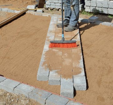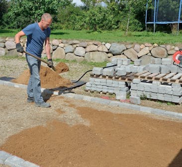 Legg avrettingssand oppå det komprimerte stabilgrusunderlaget. Fordel det så jevnt som mulig med f.eks. en jernrive eller en krafse.