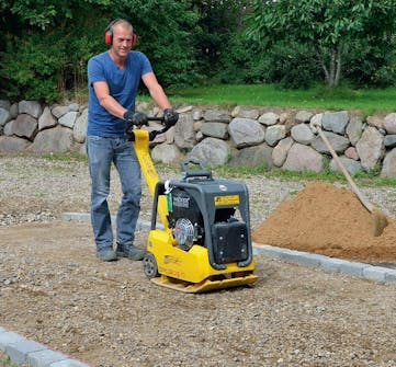 Komprimer underlaget med en platevibrator som minst veier 200 kg. Du skal kjøre to ganger over underlaget.