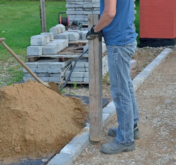 Bruk en stampestokk langs kantene. Da får du komprimert underlaget der du ikke kommer til med platevibratoren.