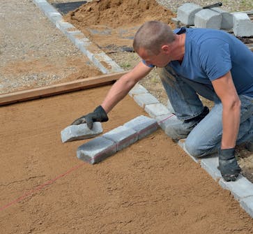 Når du har målt opp og satt opp snorer som markerer størrelsen på innkjøringen, skal du lage kantene. Det er viktig at du bruker solide kantblokker, som sikrer at belegningssteinene ikke sklir. Her er kantblokkene 14 x 14 x 21 cm.