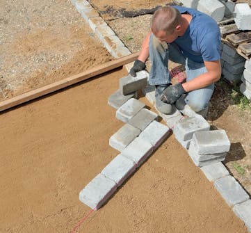 Spenn ut en snor, og legg den første rekken i den retningen snoren viser. Her skal steinene ligge på skrå i forhold til kantblokkene.