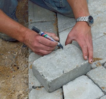 Til slutt legges de siste stumpene langs kantblokkene. Legg en stein over de resterende hullene, merk opp hvor stor steinen skal være og skjær den til.