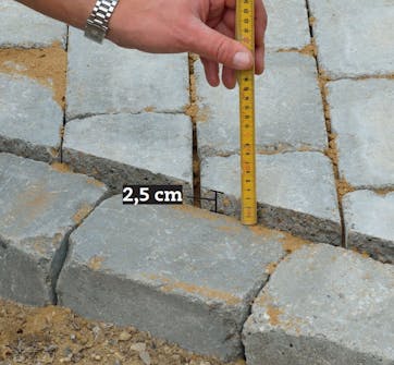 Når du har lagt fire rekker, flytter du snoren og legger fire rekker til. Snoren plasseres i den avstanden som fire rekker stein tar. Da er du sikker på at fugene mellom steinene får den samme avstanden på 2-5 mm. Det er en fordel å fylle fugesand i fugene underveis. Da kan du gå på steinene uten at de flytter seg.