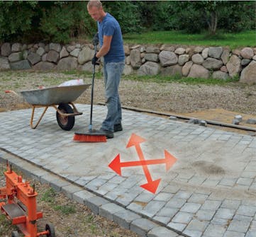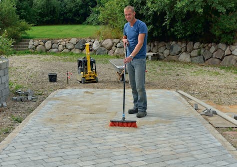 Når betongen er herdet etter et par dager, skal innkjøringen vibreres. Platevibratoren skal alltid kjøres på høy frekvens (minst 90 Hz) for å redusere risikoen for å lage skader på steinene. Etter vibreringen fyller du på fugesand igjen og feier, fjerner det overskytende og vibrerer en siste gang.