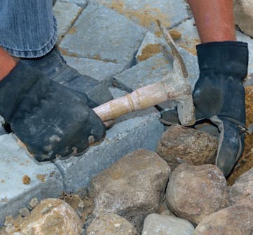 Her lager vi en overgang til garasjen med naturstein. Steinene settes i betongen på høykant, med den flateste siden opp. Bank dem på plass med en hammer, og sørg for at steinene har kontakt med steinene ved siden av.