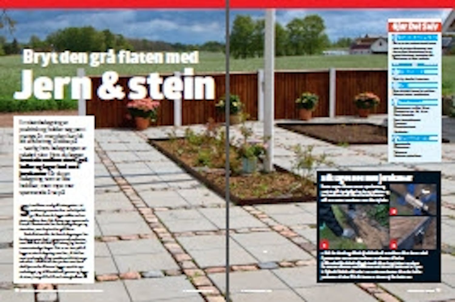 RUNDE NATURSTEIN er fine når du vil bryte store flater, slik at belegningen blir mer livlig og spennende å se på. Du kan få en ekstra stor effekt hvis du kombinerer med et helt annet materiale, for eksempel høybed av jern, som her.