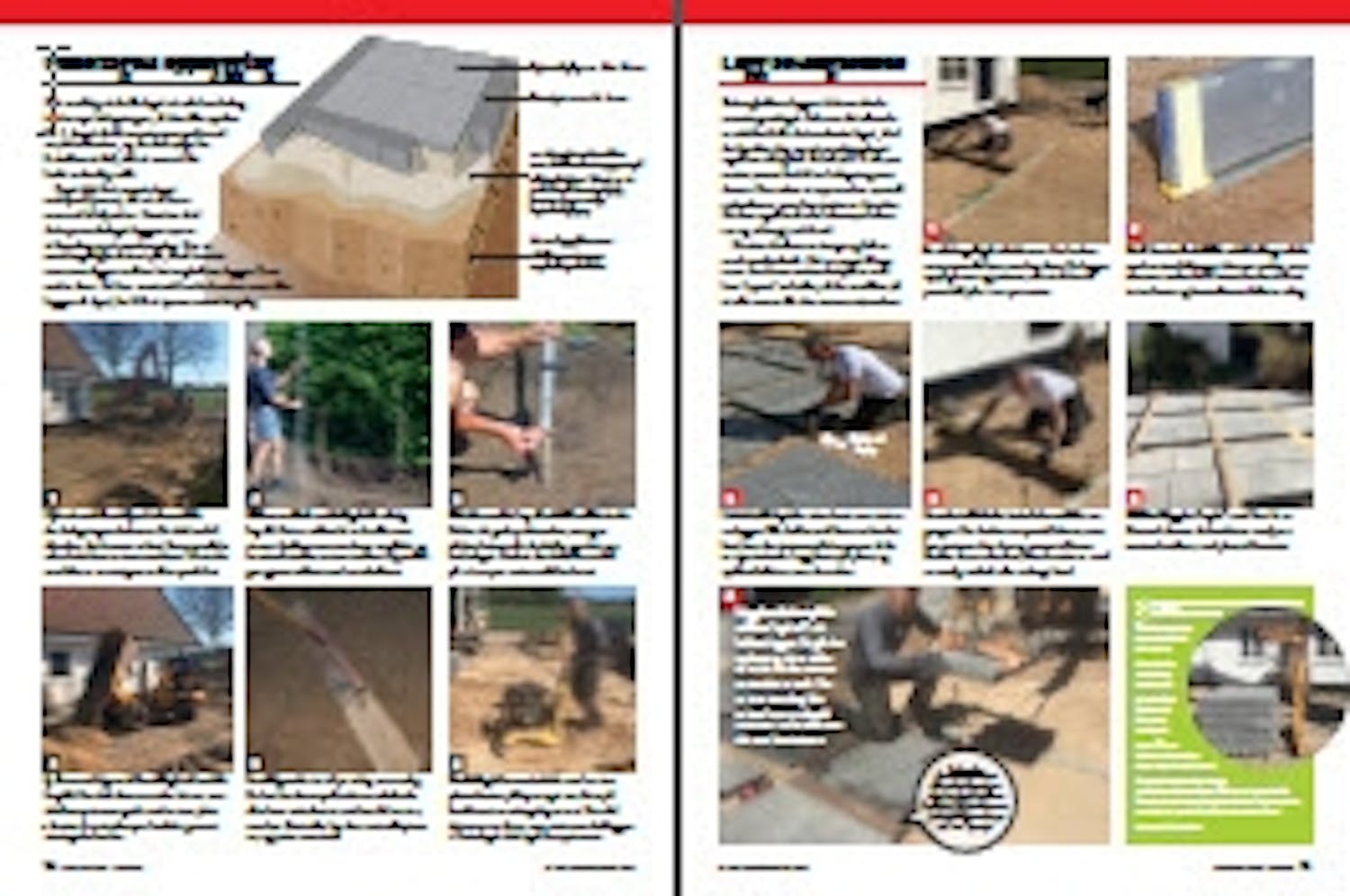 Først skal det øverste laget moldjord fjernes, slik at du kom kommer ned til råjorden. Deretter skal det nye underlaget bygges opp av et bærelag og et avrettingslag. Her er avrettingslaget ekstra tykt, fordi brostei -nene som ligger mellom betonghellene bygger 9 cm under dem. Du kan eventuelt bruke brostein som ikke bygger så dypt, for å få et tynnere avrettingslag.