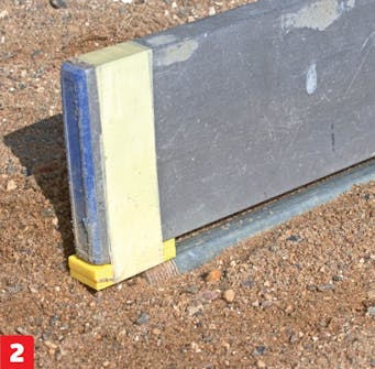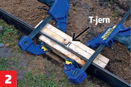 Den neste jernkanten legges inntil, slik at de to flukter i overkant. De spennes sammen med treklosser med plass til å banke ned et T-jern.