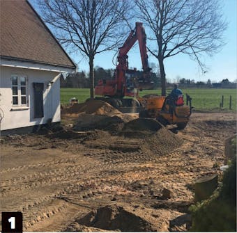 Fjern først all moldjord på området der belegningen skal være. Du skal ned til råjorden, der bunnen er fast. Store områder som dette krever store maskiner. Til mindre områder er en minigraver eller spade fint.