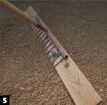 Fordel grusen i et så jevnt lag som mulig. Du kan for eksempel bruke en asfaltrake eller bare sette fast et rett bord til en rive, som her. Kontroller høyden mot målepinnene, og juster eventuelt.