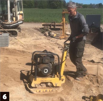 Det er viktig at du får laget et solid underlag til den nye belegningen, så den ikke synker. Underlaget skal komprimeres godt med en platevibrator, og du skal sørge for å etablere et fall, slik at vannet blir ledet ordentlig vekk.