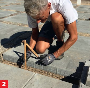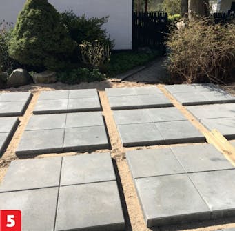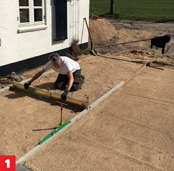 Betonghellene legges i det avrettede øverste gruslaget. Selv om det allerede er etablert fall i det underste laget, skal du forsikre deg om at avrettingslaget også har riktig fall. Et fall på 1-2 cm per meter passer fint til en belegning som denne. Her retter vi opp med en spesiell retteskinne, som kan justeres i høyden. Du kan også bruke for eksempel vannrør og et langt, rett bord.
