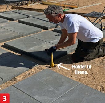 Lirene skal flyttes, etter hvert som steinene legges. Når holderen til lirene er banket fast, kan den justeres så den passer til de øvrige steinene. Legg lirene på plass, og sjekk at fallet er som du ønsker.
