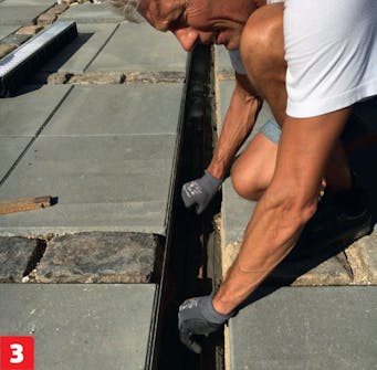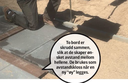 De store hellene er tunge og løftes med maskinkraft. Det er smart å lage noen bord som avstandsstykker mellom “øyene” av heller, så du er sikker på at alle renner får den samme størrelsen.