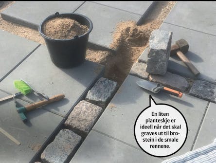 Spenn ut en snor i rennen. Snoren skal tilsvare den høyden dreneringen skal ligge i, cirka 5 mm under den øvrige belegningens høyde. Sørg også for at dreneringsrennen får et fall mot den enden der avløpet er.