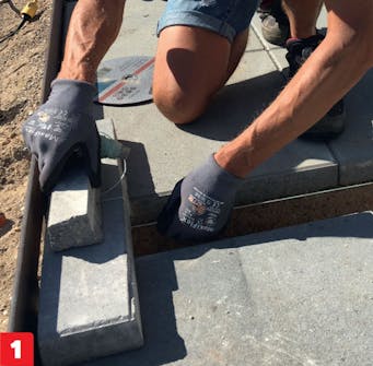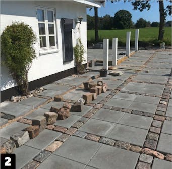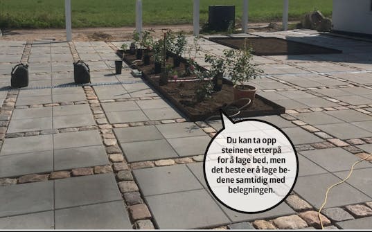 FORSKJELLIGE FARGER kan gi ekstra liv til en grå og ensartet flate. Her betyr mønsteret med de små, svarte steinene samtidig at steinene kommer til å ligge i forband, altså litt forskjøvet i forhold til hverandre. Det styrker belegningen.